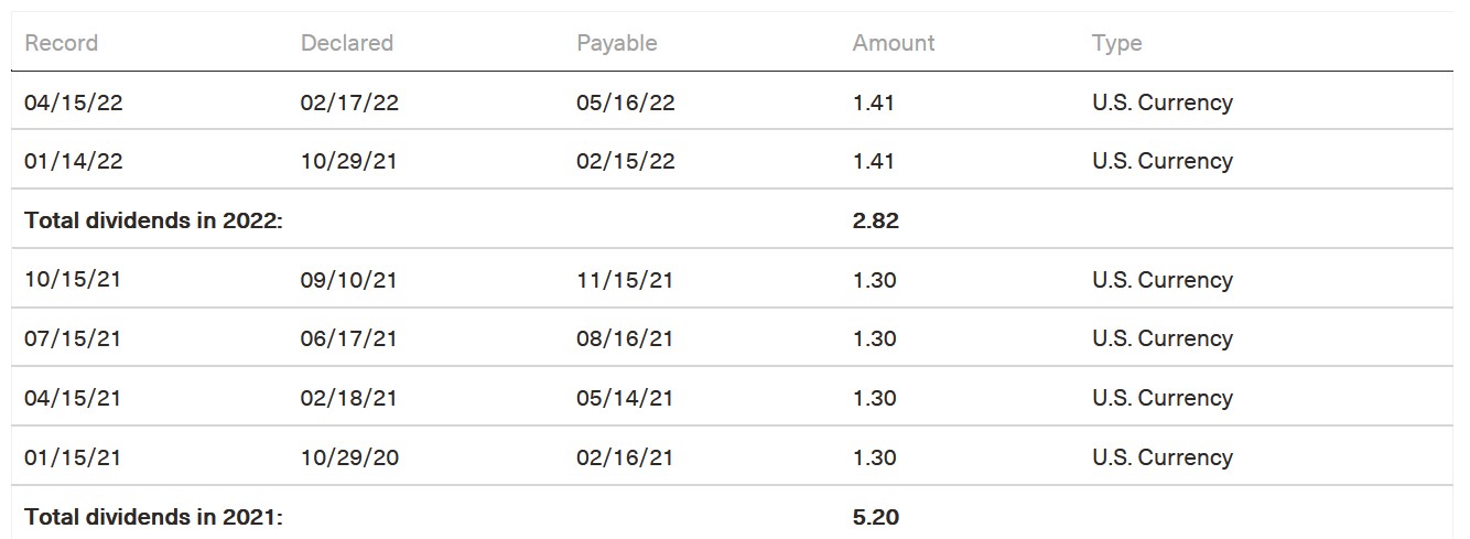 Or, investors can see AbbVie’s dividend history in the Stock Information portion of its Investor Relations page. There, investors will find that AbbVie has declared two dividend payouts of $1.41 per share so far this year, after paying out $5.20 per share in 2021.