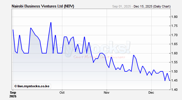 At the time of suspension, NBV shares were trading at KSh 0.71 each with a market capitalization of KSh 27.6 Million with 38,600,000 shares issued.